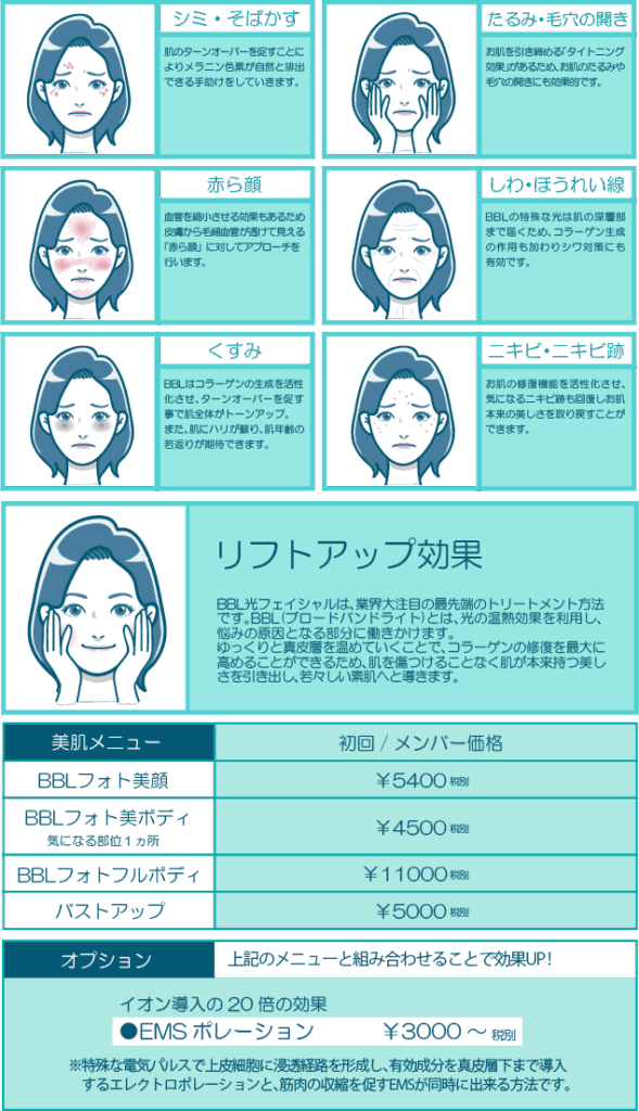 MENU 2025.10.25 2022.10.05 美しい肌 美肌 先進のBBL光フェイシャルで叶えるのは潤いに満ちた「ちゅるん肌」 業界初の新機能BBL(ブロードバンドライト)光の力でコラーゲンを増やすこと肌のキメや質感を整え、ハリのある肌へ誘導することで、、くすみ、しわ、たるみ、ニキビなどそれぞれのあらゆるお悩みを解決します。 脱毛 脱毛 小顔&痩身 小顔+痩身